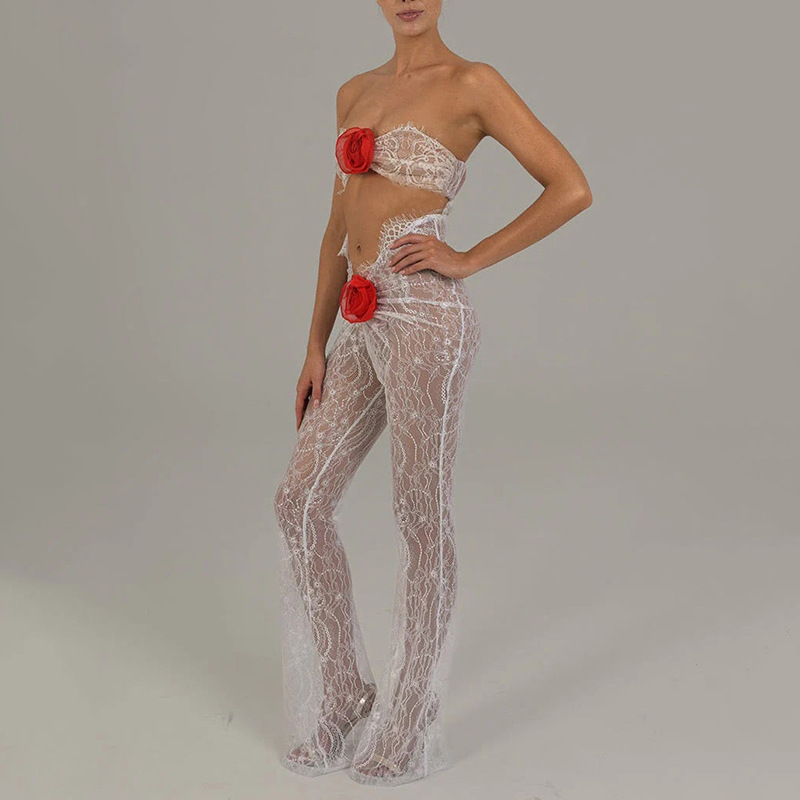 See Through Lace Bandeau and Pant 2 Piece Set with Rose/Camellia Flower